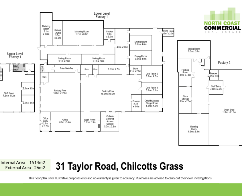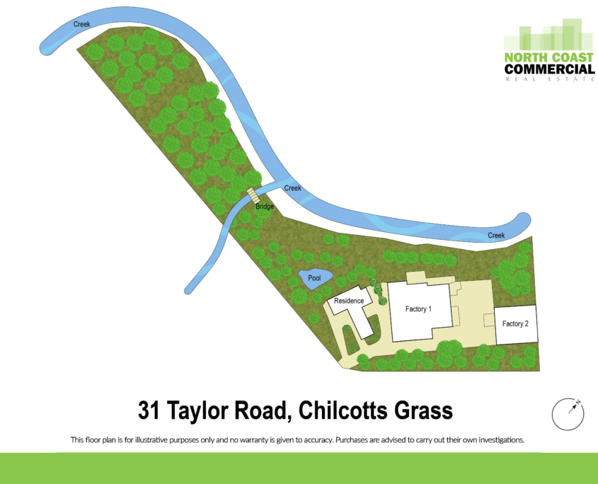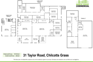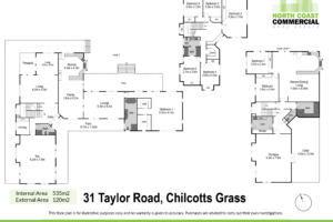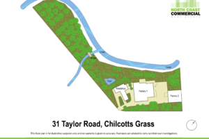 North Coast Commercial Real Estate is pleased to present to market, 31 Taylor Road, Chilcotts Grass. A unique opportunity to secure a substantial holding combining a large-scale residence with functional warehouse/industrial space, ideal for owner-occupiers and home-based businesses. The improvements offer a practical and flexible layout with high ceilings, and multiple internal areas suited to cold storage, food preparation or light industrial use (STCA). The design allows for clear separation between residential and business operations while maintaining efficiency throughout. Previously operated as a small goods processing and packaging facility.